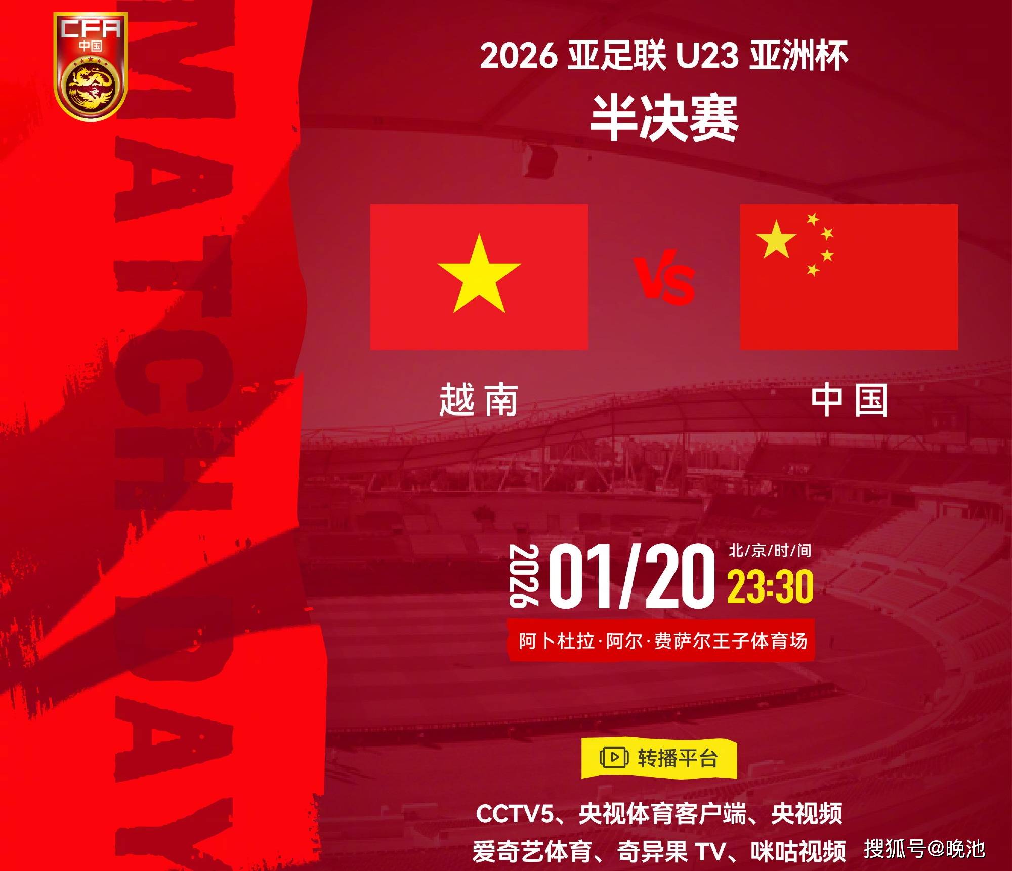 北京时间1月20日晚(今晚)23时30分,2026年亚足联U23亚洲杯首场半决赛拉开战幕,中国U-23国家男子足球队对决东南亚球队越南U23男足,比赛依然在沙特吉达的阿卜杜拉-阿尔-费萨尔王子体育场进行。