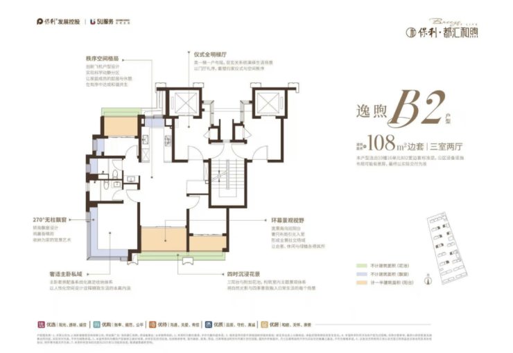 奢逸不凡的空间,小高层类一梯一户、三阳台设计(部分户型) 、270°无柱飘窗(部分)拓展生活的多维场景,全场景智能声控、智慧收纳系统、智慧家居系统等覆盖生活全场景,不仅是配置的升级,更是对从容、自在、尊严的生活方式的深切回应。