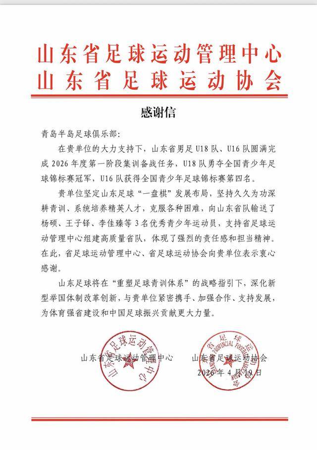 半岛体育,半岛体育官方网站,半岛体育APP下载近日,山东省足球运动管理中心、山东省足球运动协会向青岛半岛足球俱乐部发来感谢信,对俱乐部在2026年度省U18、U16男足集训备战中给予的大力支持表示诚挚感谢。在刚刚落幕的2026年中国足协青少年足球锦标赛上,山东U18队勇夺全国冠军,U16队斩获全国第四名,俱乐部输送的杨硕、王子铎、李佳臻三名球员全程参与,以过硬实力为山东足球争光添彩。